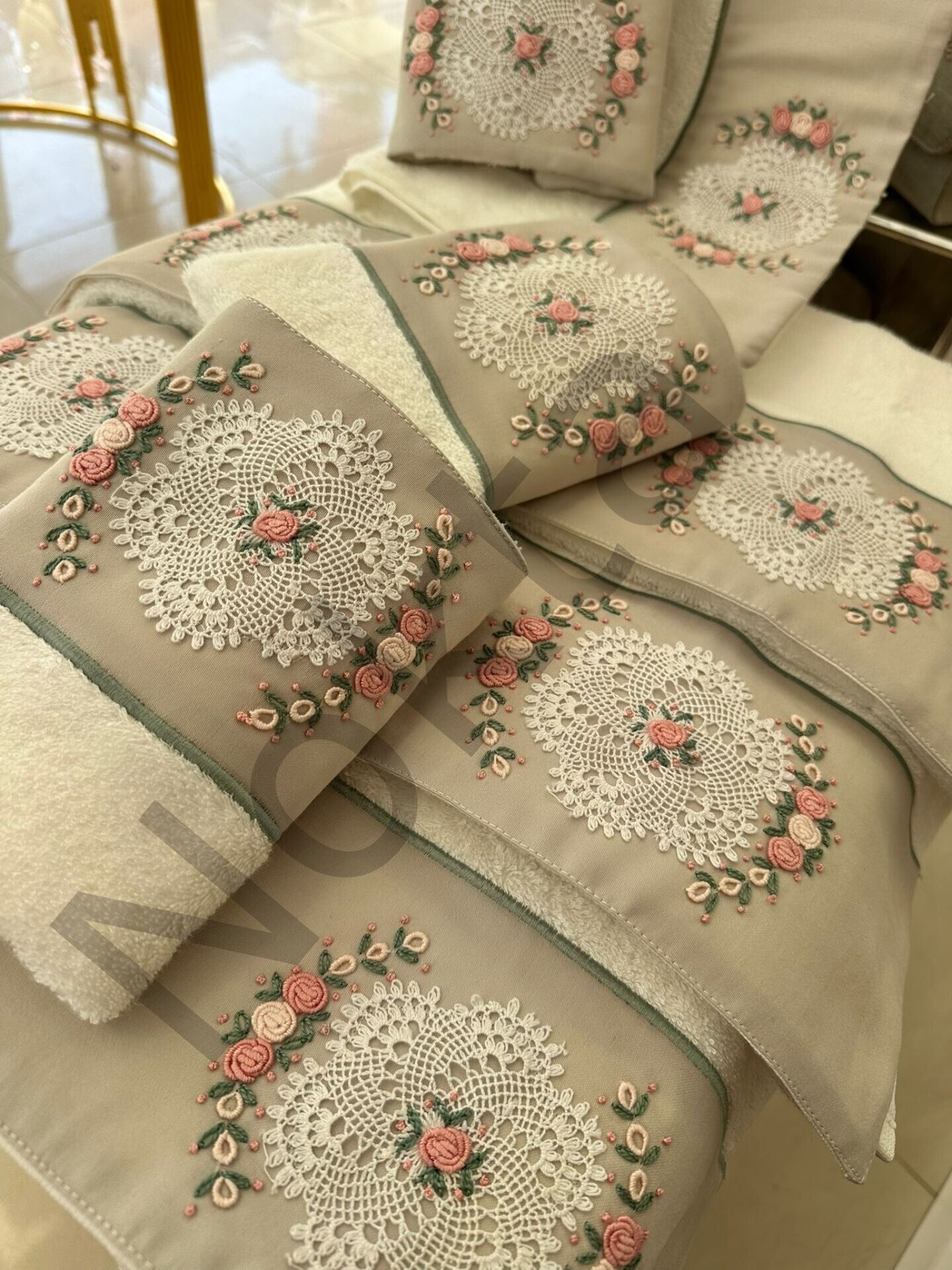 Zanaatkarlık: Tasarım üzerindeki detaylar, İğne Oyalı Model Havlu estetiğini yansıtan inovatif teknikler ile geleneksel iğne oyası işçiliğinin hibrit bir kombinasyonu ile uygulanmıştır.