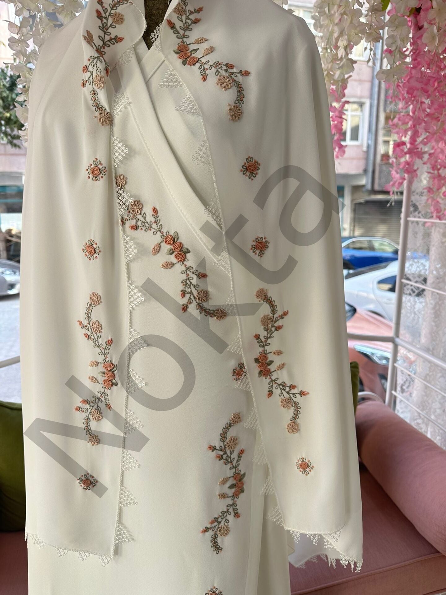 Zanaatkarlık: Tasarım üzerindeki dikiş ve kalıp detayları, V Model Krem Rengi Namaz Elbisesi Seti estetiğini yansıtan inovatif teknikler ile geleneksel çizgilerin hibrit bir kombinasyonu ile uygulanmıştır.